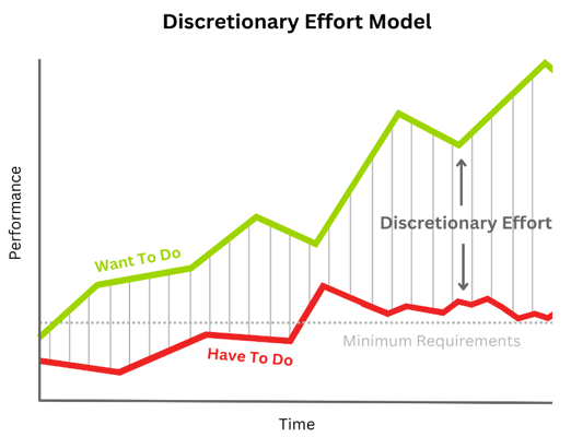 Discretionary effort is the term for the level of work or commitment that an employee could give that goes above and beyond the minimum level of effort necessary for their job function. It’s when employees are engaged with their work and willing to be engaged and committed enough to go beyond the bare minimum job requirements.